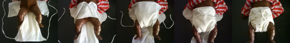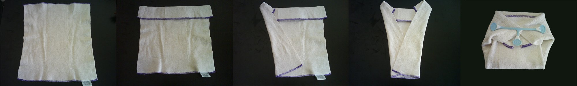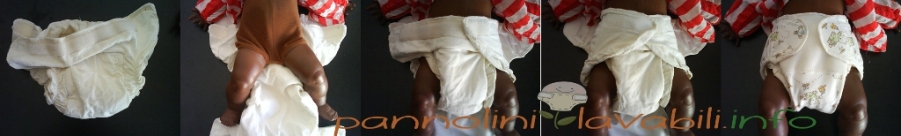 Si chiude il pannolino con laccetti, spille, snappy o si tiene semplicemente fermo con una mano (il pannolino verrà tenuto in posizione dalla mutandina).