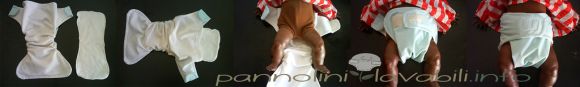 Sono pannolini che grazie al velcro o ai bottoni si possono indossare facilmente e in maniera del tutto simile agli usa e getta. Hanno al loro interno degli strati assorbenti cuciti insieme e un ulteriore inserto cucito al pannolino solo da un lato oppure, in base alle marche, un inserto separato, in modo da rendere più veloce l’asciugatura. In quest’ultimo caso, l’inserto verrà usato quando si renderà necessaria una maggiore assorbenza, come di notte o per un bambino più grande. Esistono sia in taglia unica che a taglie. Quelli a taglia unica si riducono grazie ad un sistema di bottoncini oppure ripiegando la parte superiore della patella anteriore; sono un sistema piuttosto economico, anche se generalmente vestono bene bambini dai 5 kg in su. Quelli a taglie sono logicamente un sistema più dispendioso: per ogni taglia va comprato l’intero set di pannolini. Oppure si può comprare la taglia più piccola quando si iniziano ad usare dalla nascita e successivamente la taglia unica, quando i precedenti diventano troppo piccini. La mutandina esterna è necessaria come per i sistemi precedenti per evitare di bagnare i vestitini. Essendo pannolini che “stanno su” autonomamente, consentono di lasciare il bambino senza mutandina in alcuni momenti, come durante l’estate o il riposino (usando ovviamente un telo impermeabile per evitare di bagnare il materasso – meglio ancora sarebbe usare una pelle di pecora, che garantisce il comfort del bambino e che assorbe l’umidità).