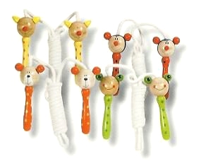Corde per saltare in legno: Corda per saltare con manico in legno dipinto e corda di cotone. Disponibile con 4 soggetti: rana verde, coccinella rosso, gatto giallo, orsetto arancione. Lunghezza 2.1 metri, manico cm 12.