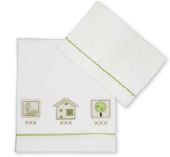 Set lenzuola culla/carrozzina in raso 100% cotone biologico, composto da federa, lenzuolo sotto con angoli e lenzuolo sopra. Colore bianco con bordino verde lime e applicazioni in verde e beige. Dimensioni cm 40x70/75 circa.
